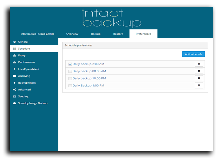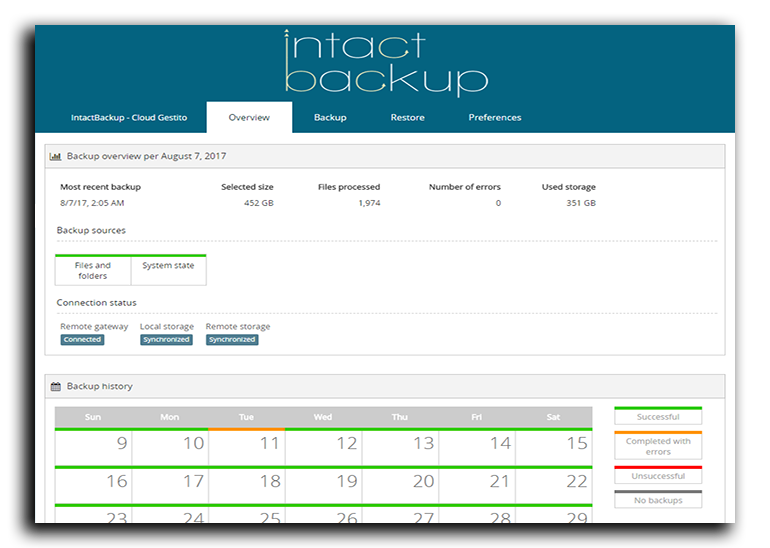 Con IntactBakcup avrai a disposizione un equipe di persone costantemente dedicate al controllo del tuo backup. Così sei sicuro che i tuoi dati siano sempre protetti e monitorati. Ti forniremo inoltre la console per la gestione dei tuoi backup dotata di funzionalità di avvisi istantanei sullo stato di ciascun backup che hai.